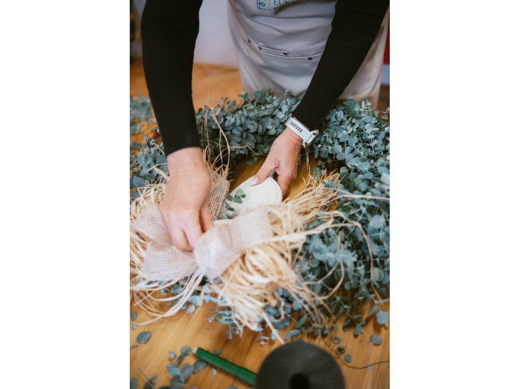 výroba jarního věnce z eukalyptu a doplňkové zeleně